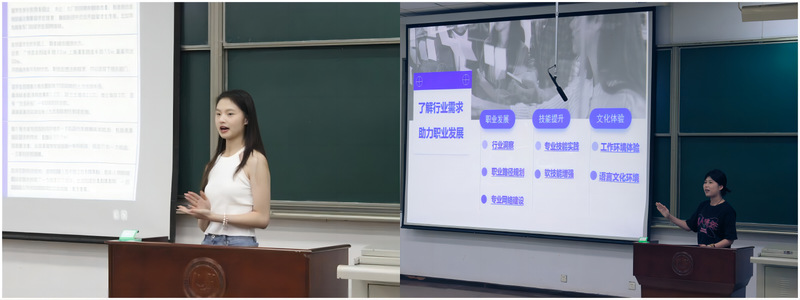 员工代表黄雨杉从留学动机、公司选择、语言学习、材料准备四个方面为同学们分享了自己的留学申请经验,提醒有出国留学意向的同学们要特别注意自己的平均绩点与雅思成绩,提前做好申请材料准备。员工代表张玉青讲述了参与香港IBEP项目的经历,为同学们展示了自己的小组作业,鼓励同学们通过国际交流实习项目来深化专业知识、提升职业技能,拓宽未来自身发展道路。