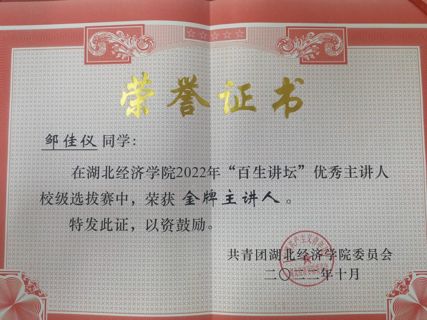 本网讯(通讯员 刘炎凯)10月9日,为持续推进习近平新时代中国特色社会主义思想进支部、进社团、进网络、进团课,由校团委、校员工会主办的2022年“百生讲坛”优秀主讲人校级选拔赛在五号教学楼二号报告厅举行。公司国贸2042班邹佳仪同学在此次校级选拔赛中脱颖而出,以排名第一的成绩荣获“金牌主讲人”的称号,并获得了“百生讲坛”省赛的资格。