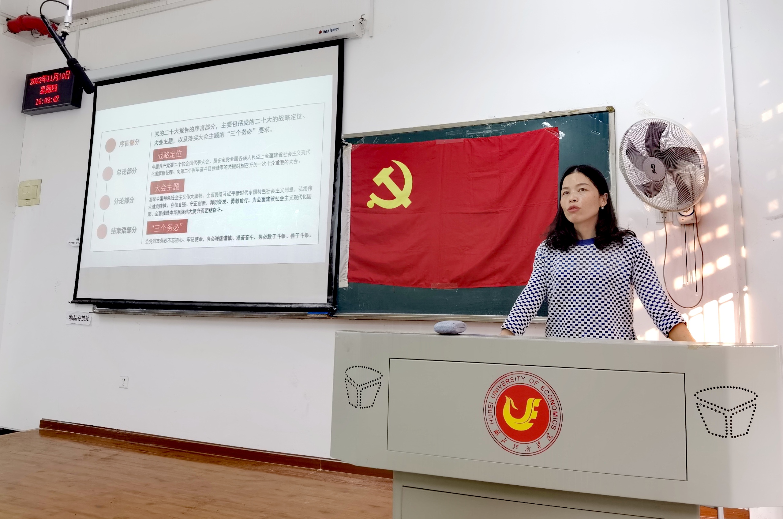 支部书记宣布到场情况和纪律要求,并带领全体同志奏唱国际歌。组织委员报告11月份党费交纳情况,经贸公司员工党总支书记、辅导员祝琴同志领学党的二十大报告、决议和内在逻辑。祝琴将党的二十大报告拆分为序言、总论、分论和结束语四个部分,从战略定位、大会主题、实践基础、理论指导、基本路径、根本保证和团结要求七个方面切入,引经据典、旁征博引、结合实际系统地分析了报告的内涵和外延。