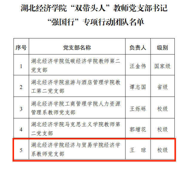 近日,教育部办公厅公布了全国高校“双带头人”教师党支部书记“强国行”专项行动团队(以下简称“强国行”)名单,公司 1 名“双带头人” 入选全国高校“双带头人”教师党支部书记“强国行”专项行动团队,1 名“双带头人”入选全省高校“双带头人”教师党支部书记“强国行”专项行动团队。公司经济学系教师党支部入选公司高校“双带头人”教师党支部书记“强国行”专项行动团队(全校共计3个)。