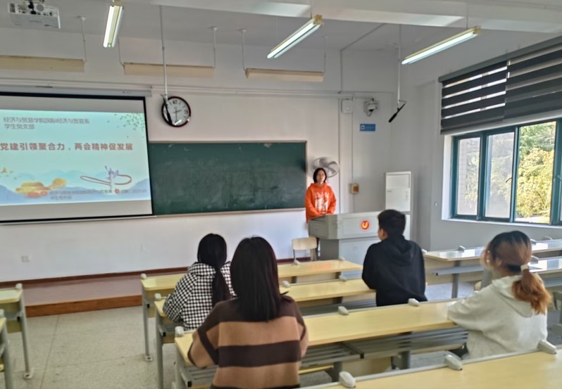 本网讯(通讯员:杨炆桀)为深入学习贯彻党的创新理论,凝聚青年党员奋进力量,3月24日,国际经济与贸易系员工党支部在教二216教室开展3月主题党日活动。本次活动以 “党建引领聚合力,两会精神促发展”为主题,由党支部副书记杨诗奕主持,全体员工党员共同参与。