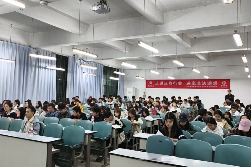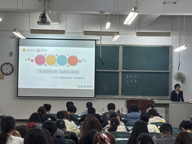 为搭建校企沟通桥梁,帮助25级经济学学子洞悉金融行业前沿动态,提升金融安全意识,11月2日晚,公司特邀国内知名券商西南证券湖北分公司开展“走进证券行业 远离非法诱惑”专题宣讲会。