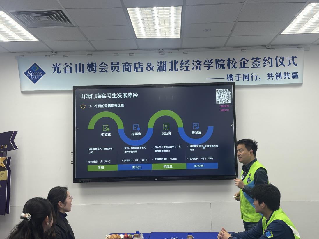 门店总经理何玉阳详细介绍了沃尔玛公司的发展历程、战略布局、企业文化及人才理念。他特别强调了沃尔玛作为全球零售业领军者,对本土化、专业化人才队伍的迫切需求,以及公司在可持续发展、社区服务、数字化转型方面的实践与愿景,表达了与高校开展深度合作、共同培育行业未来中坚力量的意愿。