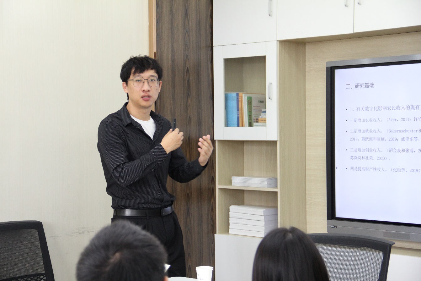 来自青年学术沙龙国际贸易方向和数量经济方向和财政与公共管理公司的老师参加了本次会议。刘东老师以 “数字乡村建设、认知能力与农村居民收入增长”为主题,对自己团队的工作论文进行了汇报。谭辉教授对论文的选题和工作量作了充分肯定,并提出了相关修改意见。