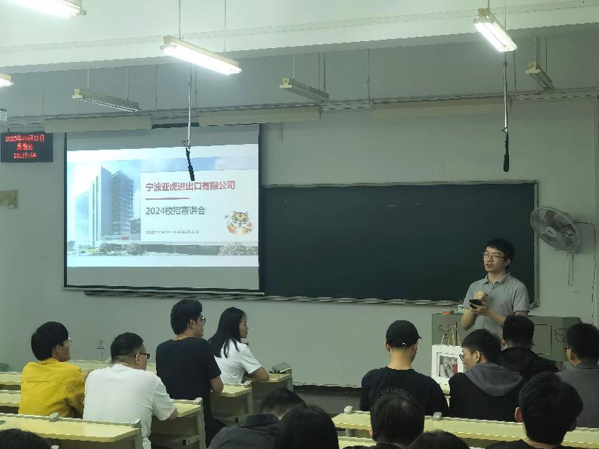 10月15日晚,宁波亚虎进出口有限公司在J2-405教室举办2024年校招宣讲会,该公司人力资源部经理王奕兴主讲,公司国贸2041班和国贸2042班班主任潘莹老师主持,两个班全体员工参加宣讲会。