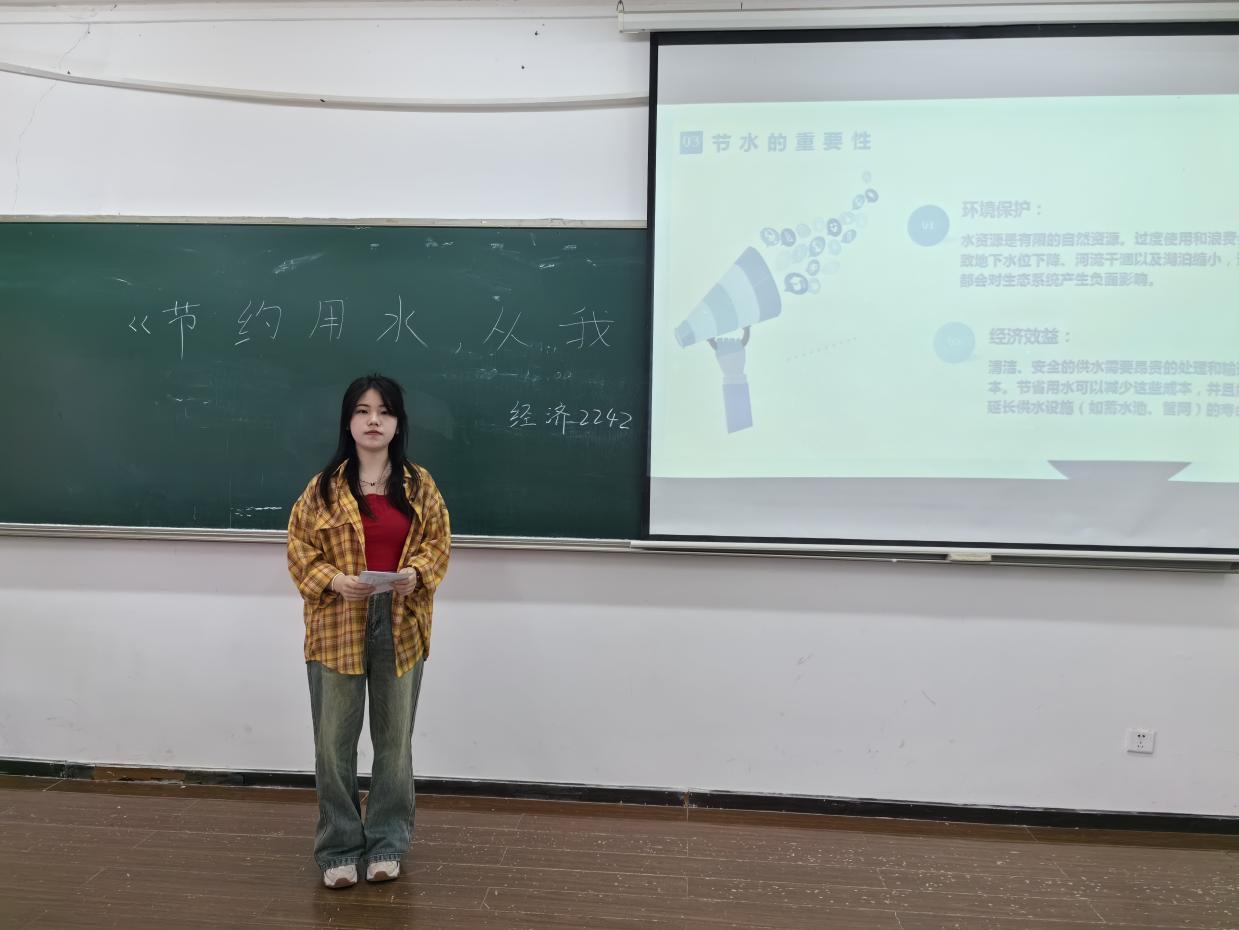 商经2241班班主任叶洪涛向同学们介绍到:“第47届联合国大会将每年的3月22日定为‘世界水日’,而我国将每年的3月22日至28日定为‘中国水周’,以此来唤醒大家的节水意识,加强水资源保护”。经济2342班辅导员陈白鸽为班级同学讲解了今年“中国水周”的主题“精打细算用好水资源,从严从细管好水资源”,强调了水资源管理不到位、利用率低、严重短缺的现状。国贸2142班班长何秋艳从自身经历出发,分享了生活中的节水小常识,提醒同学们保护水资源要从我做起、身体力行。专题学习过后,各班组织员工参与了“节水竞答”。