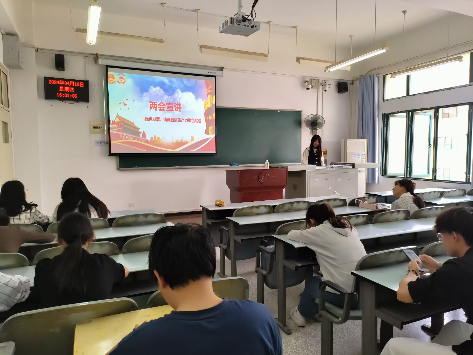 校“青马工程”藏龙班第四期成员、发展对象江立芸以《建设美丽中国先行区,打造绿色低碳发展高地》为题进行宣讲。她以习近平生态文明思想为指导,以政府工作报告中“加强生态文明建设,推进绿色低碳发展”主要任务为引线,系统描述了中国在参与和推动完善全球环境治理,推进自身碳减排,实现绿色转型的突出贡献。
