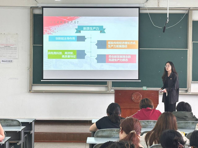 国际经济与贸易系员工党支部党员何秋艳作了主题为《念好“三字诀”——为新质生产力赋能青春力量》的报告,围绕新质生产力这一热点话题,由浅入深地为同学们介绍了新质生产力的概念、类别和内涵,并从科研立项、就业创业、发展规划等方面详细阐述了新质生产力与新时代老员工的内在联系。