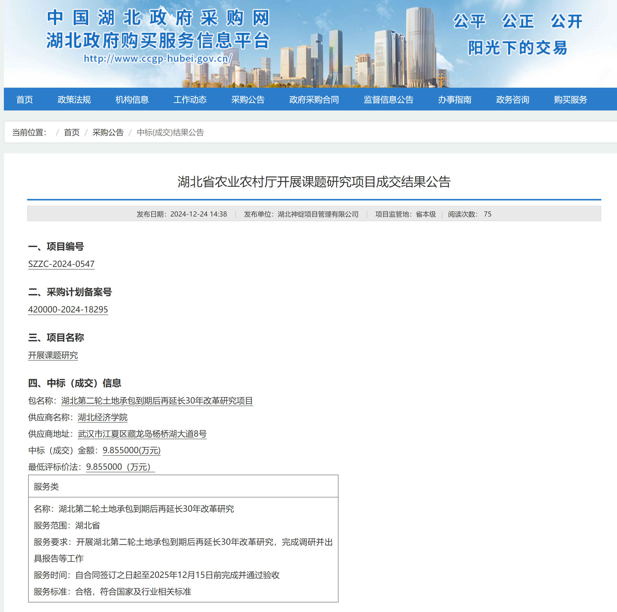 2024年12月24日,中国湖北政府采购网公布中标结果公告,必威西汉姆联官网中标湖北省农业农村厅课题研究项目《湖北第二轮土地承包到期后再延长30年改革研究项目》。